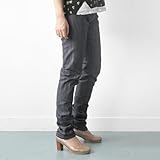 マリメッコから待望のデニムジーンズが登場しました!生地はジーンズの産地として知られる岡山で生産。ストレートタイプとスキニータイプの2種類がございます。マリメッコのロゴが入ったオリジナルのボタンがポイント。さらに「m」マークのピンバッチもついていて、取り外し可能ですので好きな所に付けることができます。生地の耳はセルビッチ仕様。こちらはスキニータイプの28インチサイズ。生地の性質上、はじめは着用したときにかなり生地が硬く感じられます。ストレートタイプに比べると裾は長め、股上は浅めのデザインになります。